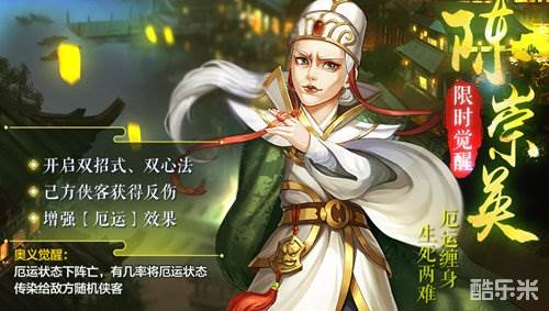 七伤横空出世,“厄运”花样百出。陈崇英是东厂头目,手段阴狠,武功造诣不明。作为辅助型后排内力侠客,陈崇英可大范围长期削弱敌方,禁止敌方回气,治疗自身。陈崇英6星造诣时,当己方侠客攻击时,额外有25%的几率对目标施加1种随机厄运状态,若目标厄运状态总层数达到4层,则使其受到陈崇英(攻击*240%+内力*240%)无视防御伤害,并祛除所有厄运状态。