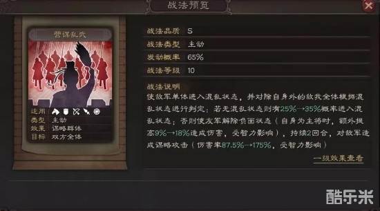 营谋乱武,主动战法,发动率为极高的65%,目标为敌友军全体,效果我们分四段来看。