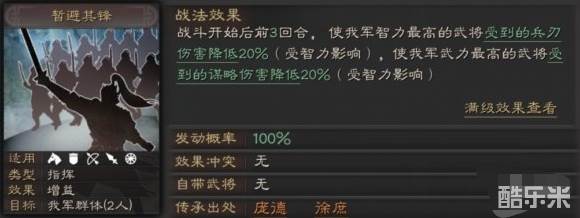 可拆战法【指挥战法】暂避其锋:前3回合,使我军智力最高的武将受到兵刃伤害降低,使我军武力最高的武将受到的谋略伤害降低。