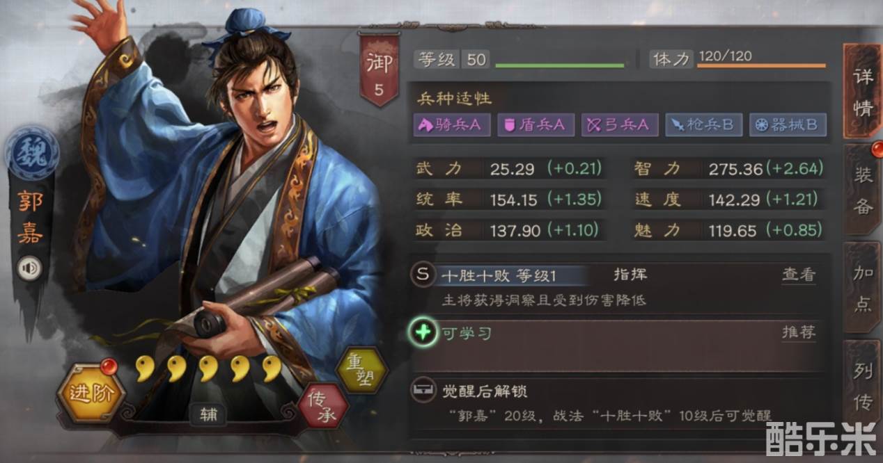 在三国志战略版中,郭嘉是一位实用的辅助武将,在队伍输出不够时也可以配输出战法以补充队伍输出。在属性成长上,郭嘉有着高额的智力成长和不错的统率成长,佩戴输出战法就能发挥出辅助输出兼并的特质。兵种上郭嘉具备了三种A级兵种适性,虽然没有S级兵种适性,但是搭配起来比较丰富,适合辅助角色。