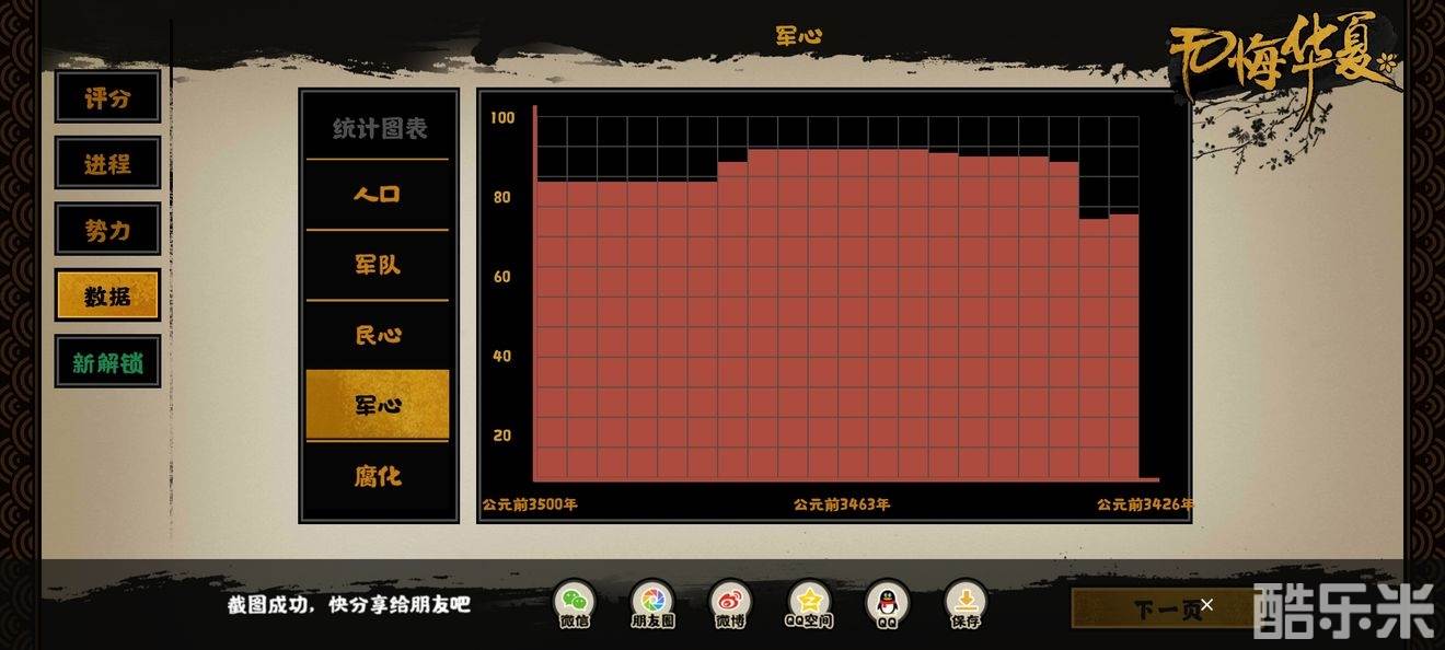 首都可以很轻松的保持很高的军心和民心,这是比较好弄的,打下来的城市建议选金钱发展,个人猜测腐败占的最后结算的比分很大。