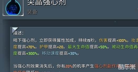 雨中冒险2尖晶强心剂效果是什么是一篇精彩的文章。喝下强心剂,立即获得属性加成,持续15秒。伤害提高+100%。攻击速度提高+70%。护甲提高+20。最大生命值提高+50%。被动生命值再生速度提高+300%。移动速度提高+30%。当强心剂效果消失后,你有20%的机率产生强心剂副作用,你的所有属性将会降低5%(每层-5%。
