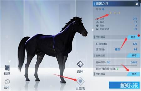 马匹:马匹可以通过风之试炼获得套马索在地图上抓马点抓马然后喂养培养二代,也可以通过拍卖行花钱买高星级的马培养后代或者直接培养。越高星级的马激活属性后会给自身附近更多的属性。喂养马匹的马料每天在大地图通过割草可以获得20个(记得每天去弄),通过培养二代可以提高马匹的血统到达一定数值以后可以获得更高星的马用来提升自身的战力。