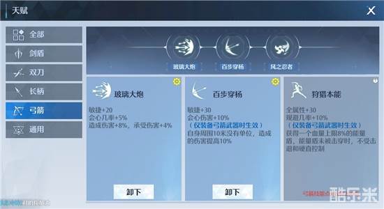 天赋搭配推荐弓箭带玻璃大炮和百步穿杨,最后一个选择通用天赋里面的银色子弹or风之忍者(分别对应暴击和会心),本身弓箭幻灵的技能会提升自身会心;可以根据自身幻灵附身来自由搭配合适的技能。