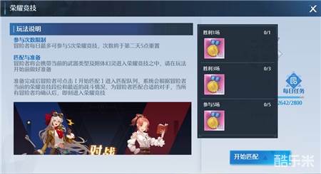 全天开放的一场定胜负的日常每天可以参与5次荣耀竞技完成对应的任务获得竞技胜点的奖励。因为赛季奖励和段位奖励和巅峰对决选最高段位,所以作为一个日常任务每天打5次完成即可
