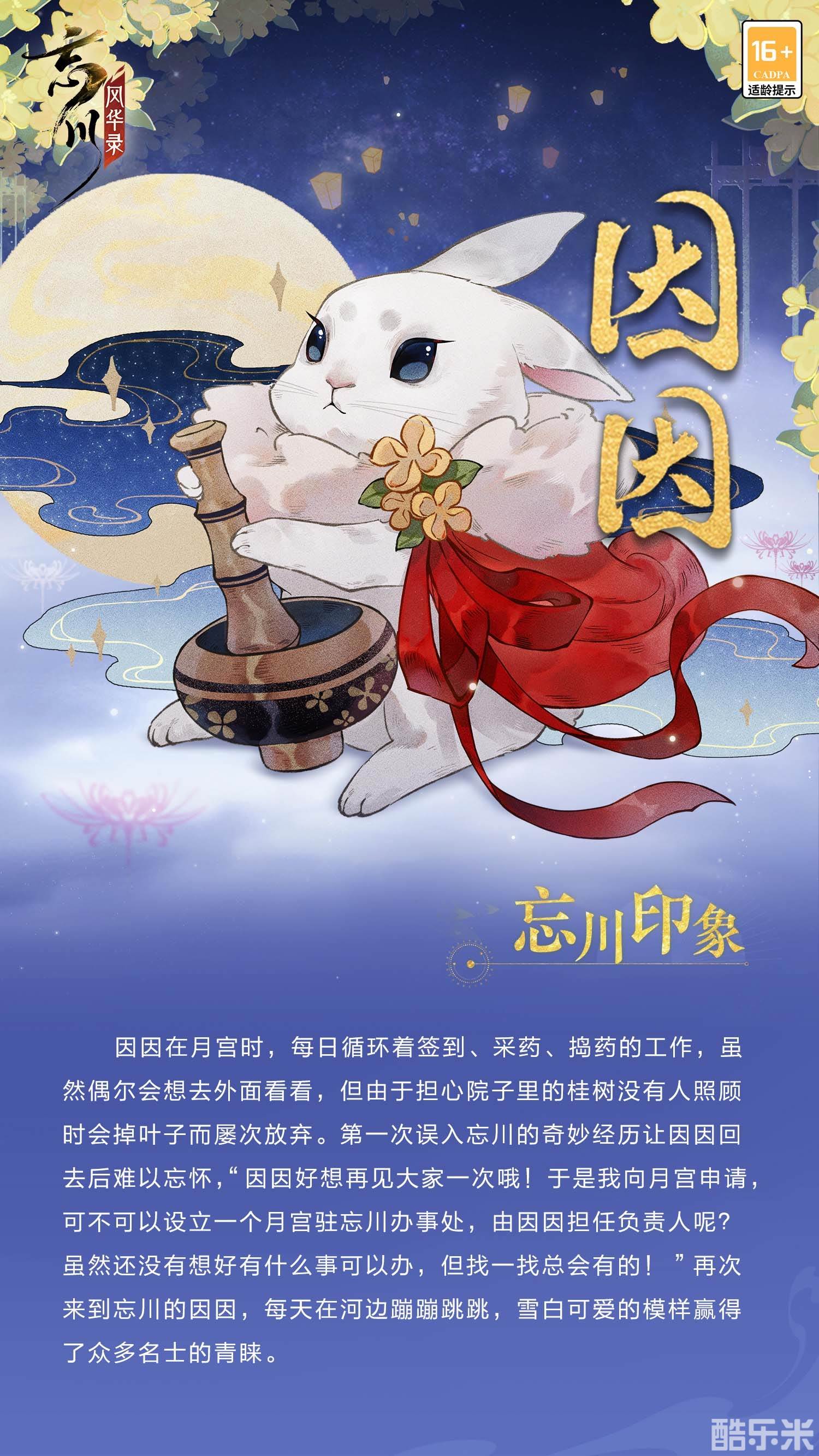 因因,月宫中负责制药的兔子,日复一日不辞辛劳地完成着自己的工作。因因一直心怀设立月宫驻忘川办事处的念想,而它蹦蹦跳跳、雪白可爱的模样赢得了众多名士的青眼。同时也增添了不少烦恼,因为太多路过的阴灵用胡萝卜投喂他,它可是一只不爱吃胡萝卜的兔子啊!
