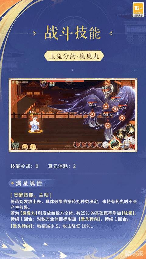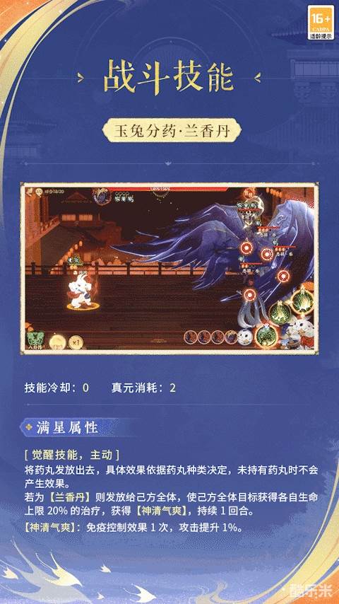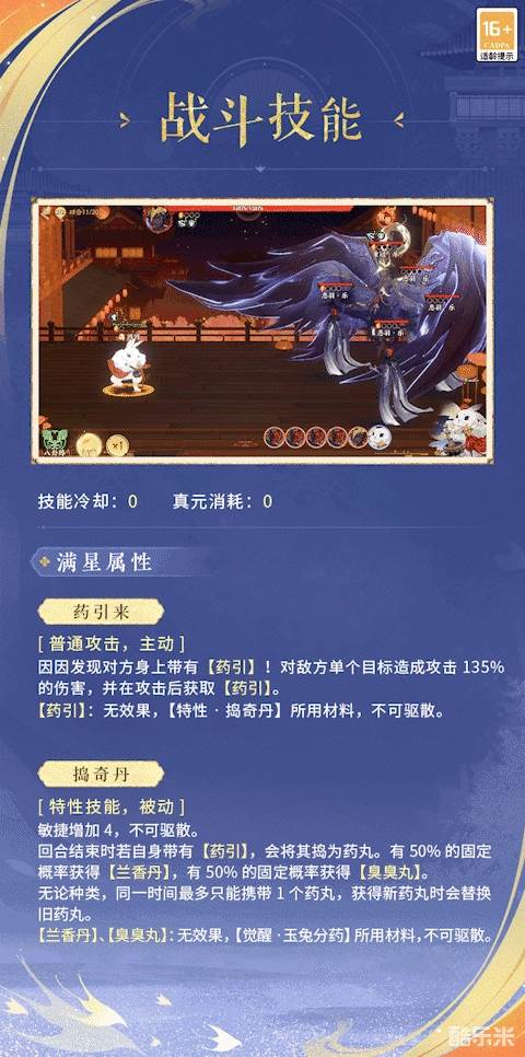 因因在战斗中作为辅助出战!它以技能【药引来】为普通攻击,【捣奇丹】为特性技能,【玉兔分药】为觉醒技能,因因捣药,神清气爽!