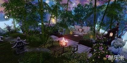 玩家墨客惜情的仙府中,粉色的樱花开满庭院,翠色的竹林闹中取静,远处还有悠悠湖水,动静之中,于竹林中休憩,抑或漫步樱花树下,感受樱吹雪的美景,也足以见到玩家的用心。