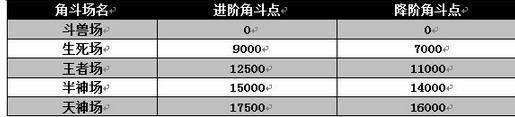 当玩家当前角斗点大于下一阶的进阶角斗点,则可选择进阶,进入下一阶段的角斗场。当玩家当前角斗点小于所在阶段的降阶角斗点,则需要进行降阶,回到上一阶段的角斗场。进阶&降阶如下: