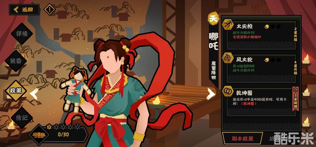 哪吒不用说,军事名臣千千万,说到第一梯队就离不开他的名字,作为一个什么时代都能用的名臣,他的定位是高额战斗力加成,适合搭配高民心体系,其核心技能在夏商周仁义之师讨伐无道才是完全体。