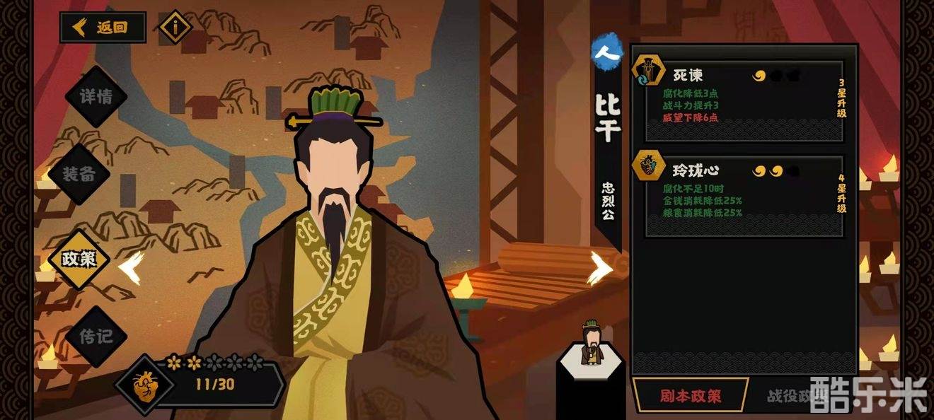 首先民生这里大多都是减消耗,加人口增速和钱粮产量的技能居多,基本偏刷资源很少有能配合别的体系的,但比干显然是一个例外,他自带循环技能和buff技能让他自成一系。低腐化和减钱粮消耗都是非常有用的属性。是一个可以一直用到后期的好名臣。