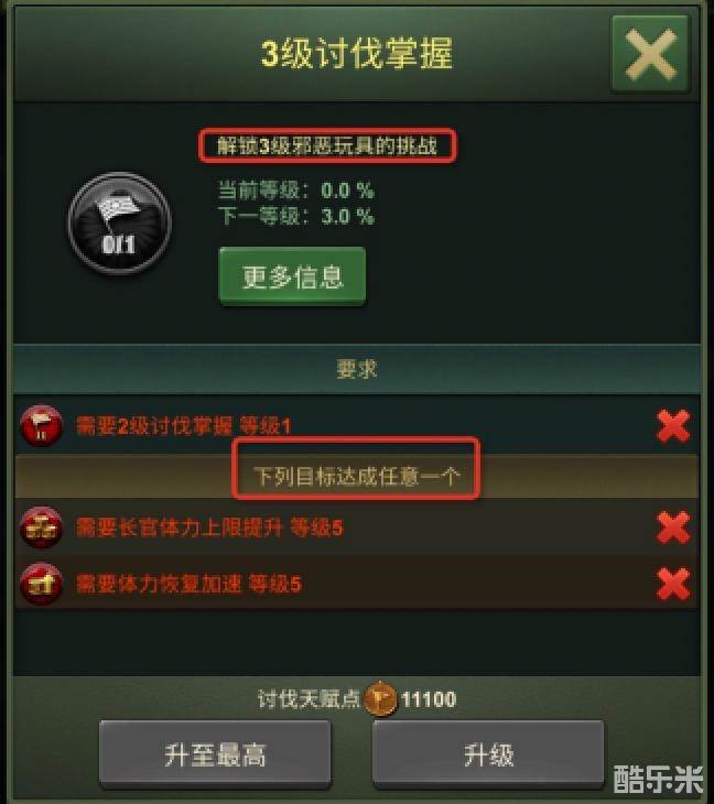 战胜等级越高的邪恶玩具可获得更多的奖励,因此尽快激活讨伐掌握天赋(决定了可攻打邪恶玩具等级)是不二之选。但前期我们的天赋点并不富裕,此时我们并不需要把讨伐掌握以及前置天赋升到满级来解锁下一级天赋,升到所需的等级就足够。