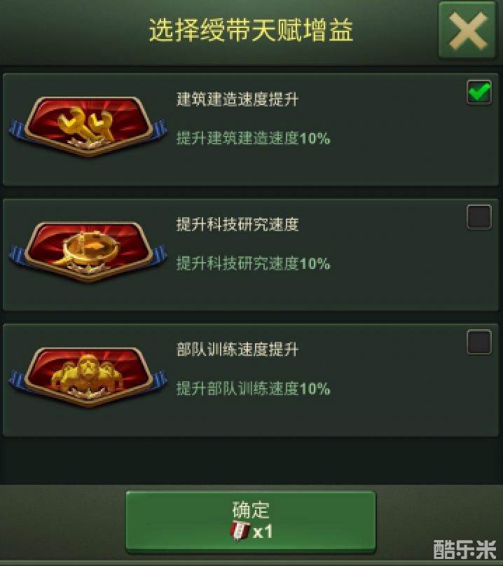 升级初级绶带天赋时,前期可选择“提升建筑建造速度”这个增益项目;如果你拥有充足的金币,在科技研究时,可切换为“提升科技研究速度”增益;每周五(服务器时间)配合个人限时活动的士兵训练任务,可以选择提升部队训练速度,囤积更多士兵。