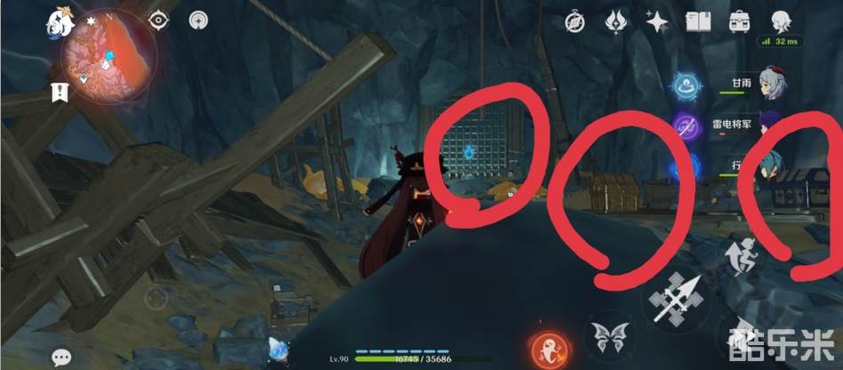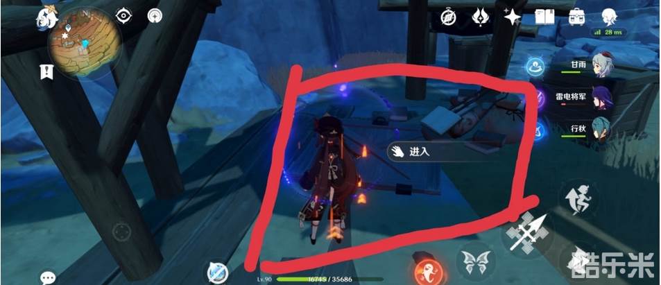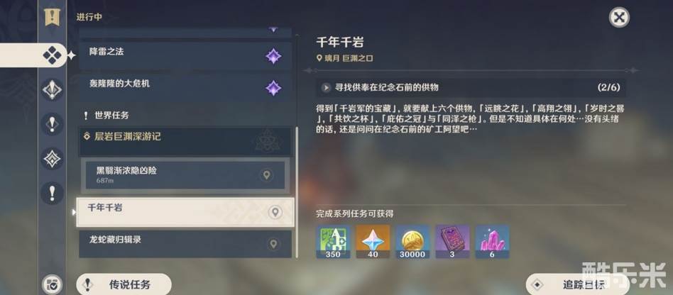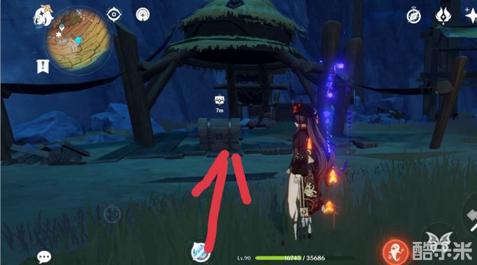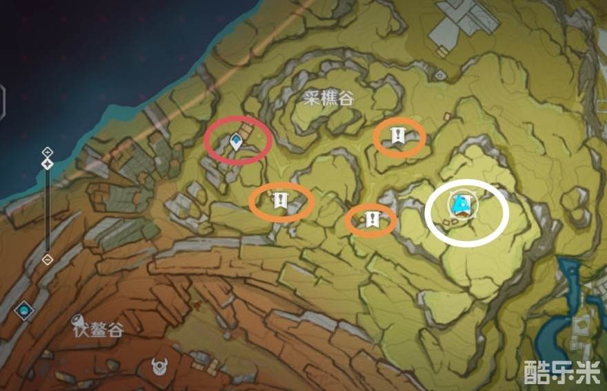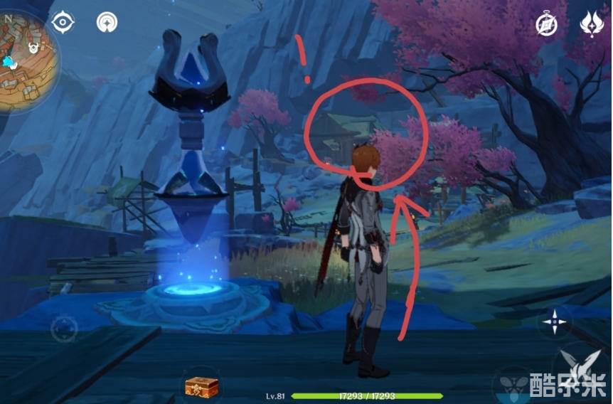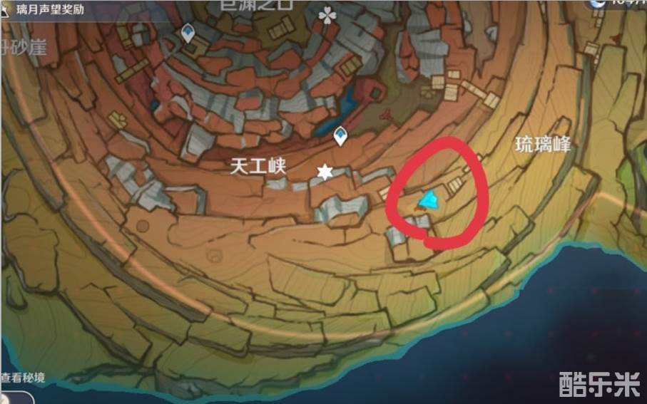 (1)第一张藏宝图是在地面上,需要到这个传送点然后沿着路往前走到图中圈住的草屋前,去和千岩军打一架,然后会触发剧情,千岩军彦博会和你对话并发布任务。