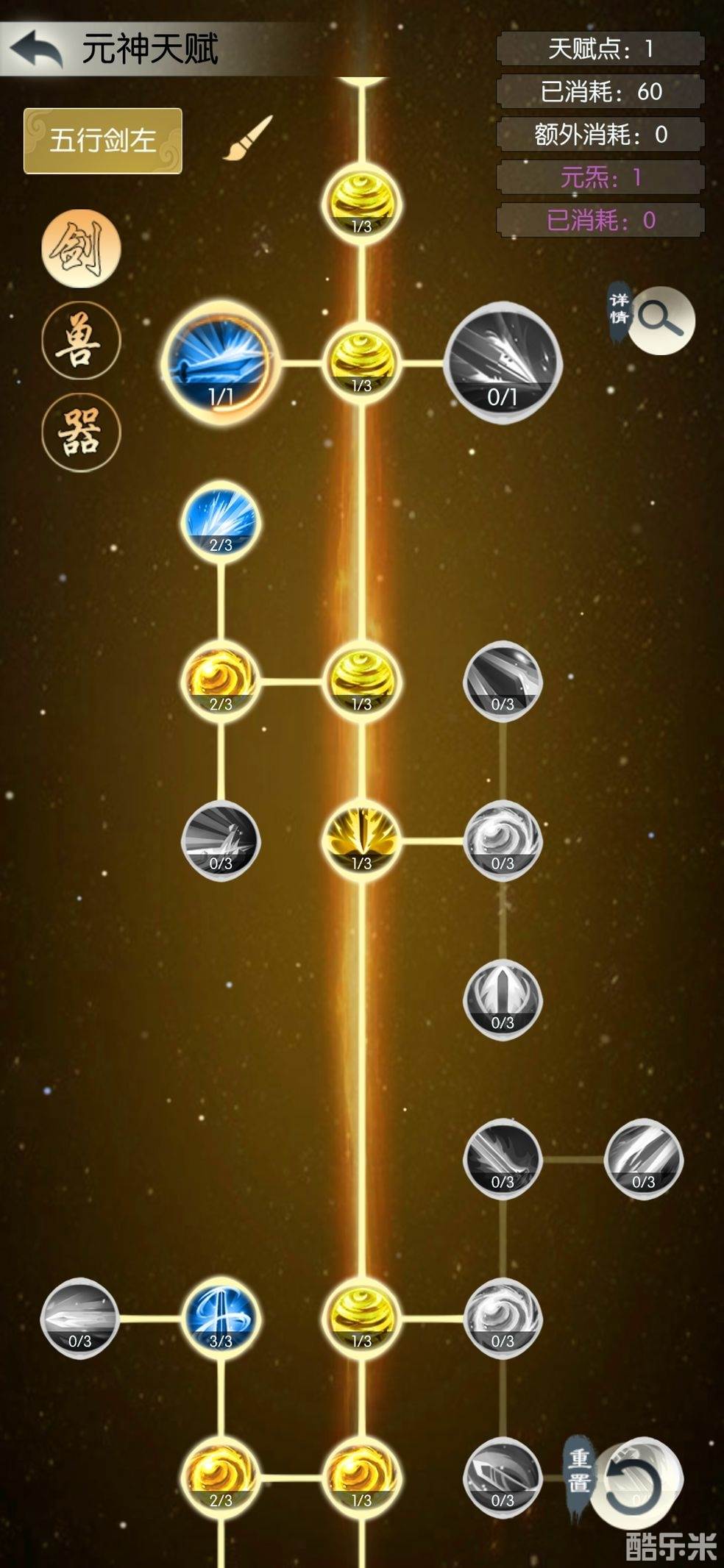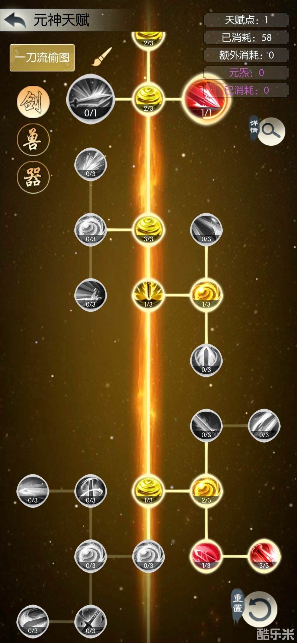 想要做极限玩家的话,元神天赋剑右,点满存在一个buff加伤害的那个技能,灵兽带三个百分之25及以上能触发的持续六回合buff技能。招式带5+1:魔胎+孔雀+五鬼+缥缈+罗烟+13倍主五,打一刀流。这个思路更适合偷【东极岛】,过神鹿同属性下没有上面的方案稳定,仅限于偷。
