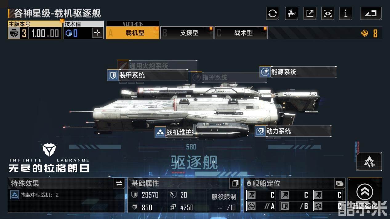 T1阶的谷神星级-载机驱逐舰可搭载两架中型战机,并且能维修返回母舰的载机10%的血量。此艘舰船本身的各项属性并不十分出色,其实力取决于搭载的舰载机,若有幸获得林鸮A100型优秀战机,可配合战机重点培养此驱逐舰。
