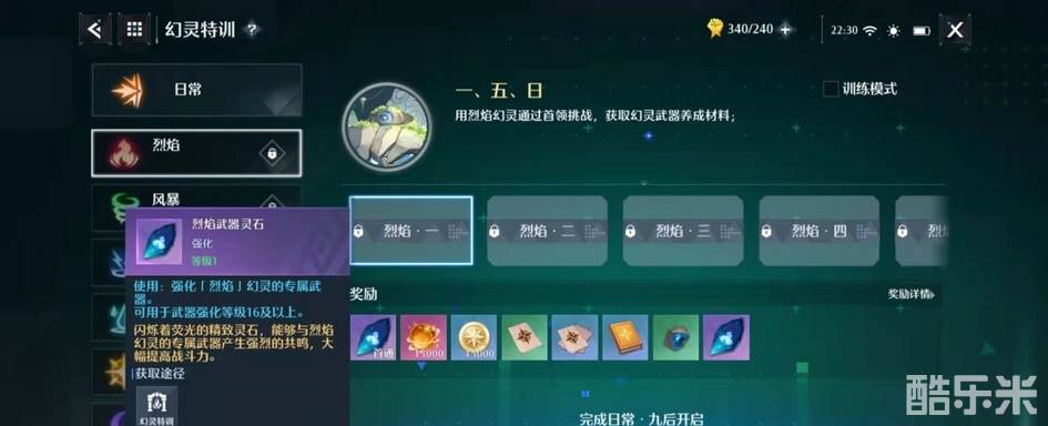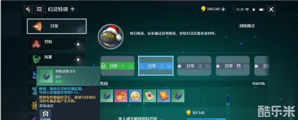 第二部分是日常特训,玩家会从每日挑战中获得一些基础材料,包括初级武器灵石,幻灵经验凭证以及金钱和经验。