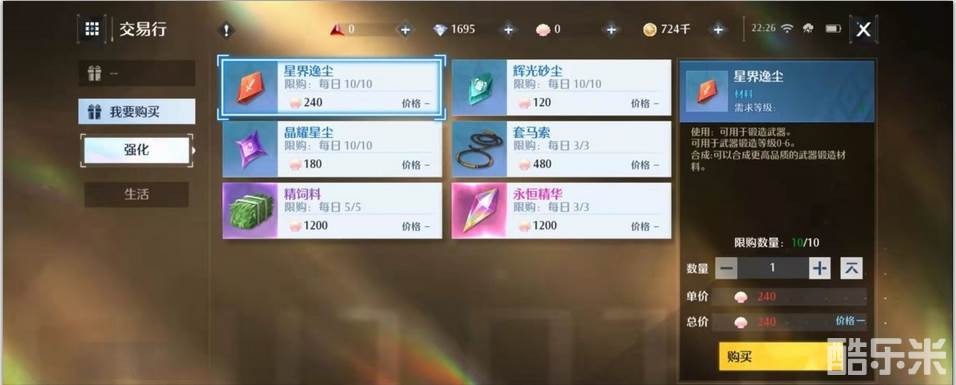 首先是强化材料星界逸尘,星界逸尘可以锻造武器从0到6级,星界逸尘可以合成更高品质的武器锻造材料,出处:困难副本和商会,购物中心(每日限购10次)