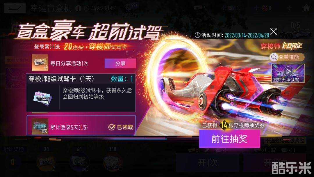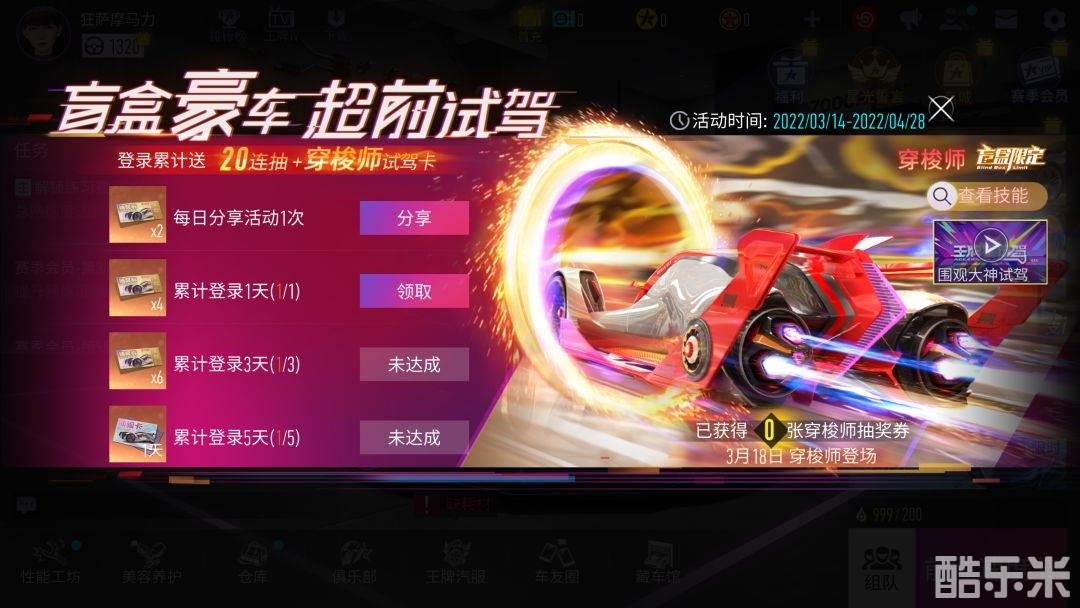 穿梭师【超前试驾】活动正在火热进行中!每日登录、分享活动即可免费领取20连抽专属盲盒券,助力车手轻松提神车;累计登录五天更能获得“穿梭师”试驾卡,感受“穿梭师”所带来的前所未有的竞速体验!