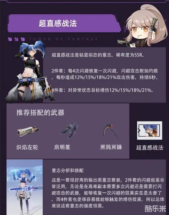 意志分析和搭配:这是一套很好用的输出类意志套装,2件套的闪避效果非常泛用,无论是在高难副本需要多次闪避还是需要打闪避攻击的武器,能够恢复一次闪避的效果实在是太香了。