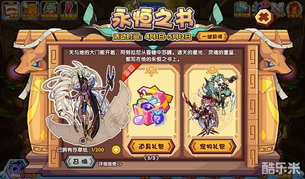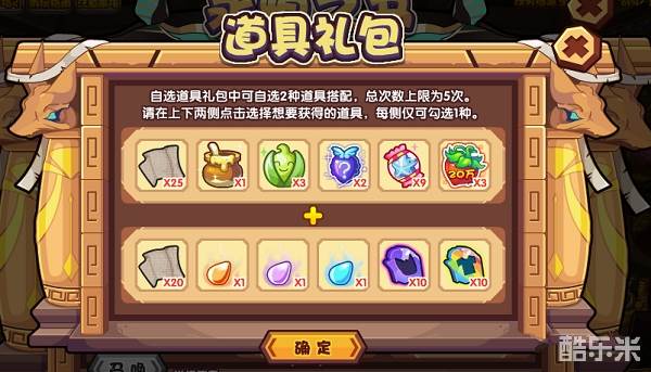 《永恒之书》活动中礼包分为两种,一种是道具自选礼包,一种是宠物礼包。点击【道具礼包】按钮进入自选道具界面。自选道具礼包中我们可以选择2种道具搭配,礼包的总获得次数上限为5次。需要在上下两侧各点击选择想要的道具,每侧仅可勾选1种。
