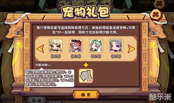 宠物礼包的可选择内容就更多了,点击【宠物礼包】按钮进入宠物选择界面。每只宠物有两种方式获得。我们可以单独选择宠物,或者选择宠物+莎草纸*20的方式一起获得。