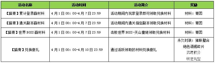 4月1日-4月10日正式服将开启踏青活动,活动期间内玩家每日登录游戏、参与特定副本、击败世界BOSS-天山童姥即可获得丰厚奖励;挑战“跳跳乐”小游戏获得代币,通过代币可兑换奖励,欢迎英雄、女侠前来参与。
