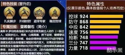 罗伯特森是一位优质的突破手,金色的速度属性搭配10级脚踝终结者让他拥有顶级的脚踝能力,能轻松获得空位机会!同时7级三分射手+7级中距离之王+7级后仰强化+完美投篮,搭配紫色的三分、稳定和金色的中投属性,让罗伯特森中远距离投射极其稳定。