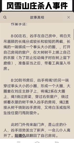 此时门外传来敲门声,是山庄的仆人,凶手顺势发出了鼾声,一会儿仆人离开了。陆靖仇就翻回了自己房间。