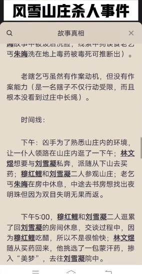下午:凶手为了熟悉山庄内的环境,让一仆人领路在山庄内逛了一下午;林文煜想要与刘雪凝私奔,派随从下山去买药;穆红鲤和刘雪凝二人参观山庄;老乞丐朱晦在房中休息,中途去书房想找出夜明珠但因为双目失明无果而返。