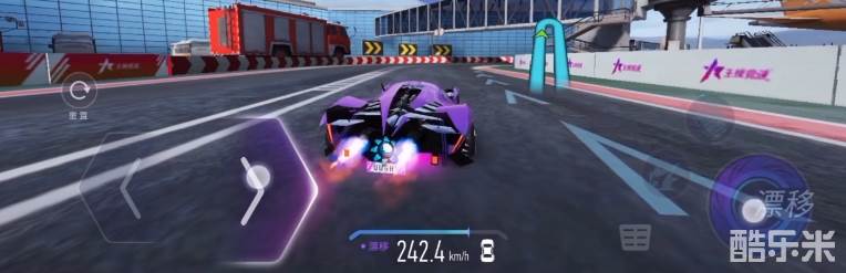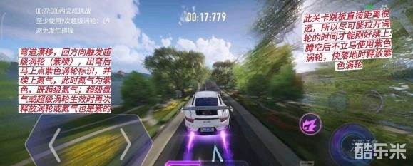 弯道漂移,回方向触发超级涡轮(紫喷),出弯后马上点紫色涡轮标识,并续上氮气,此时氮气为紫色,既超级氮气,超级氮气或超级涡轮生效时再次释放涡轮或氟气也是紫的。
