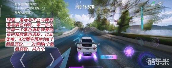 同理,落地后不立马释放落地紫色涡轮,等一秒左右前一个紫色涡轮快要结束时释放紫色涡轮,以此类推,4次腾空落地共8个超级涡轮,一次漂移1个超级涡轮,共九个。