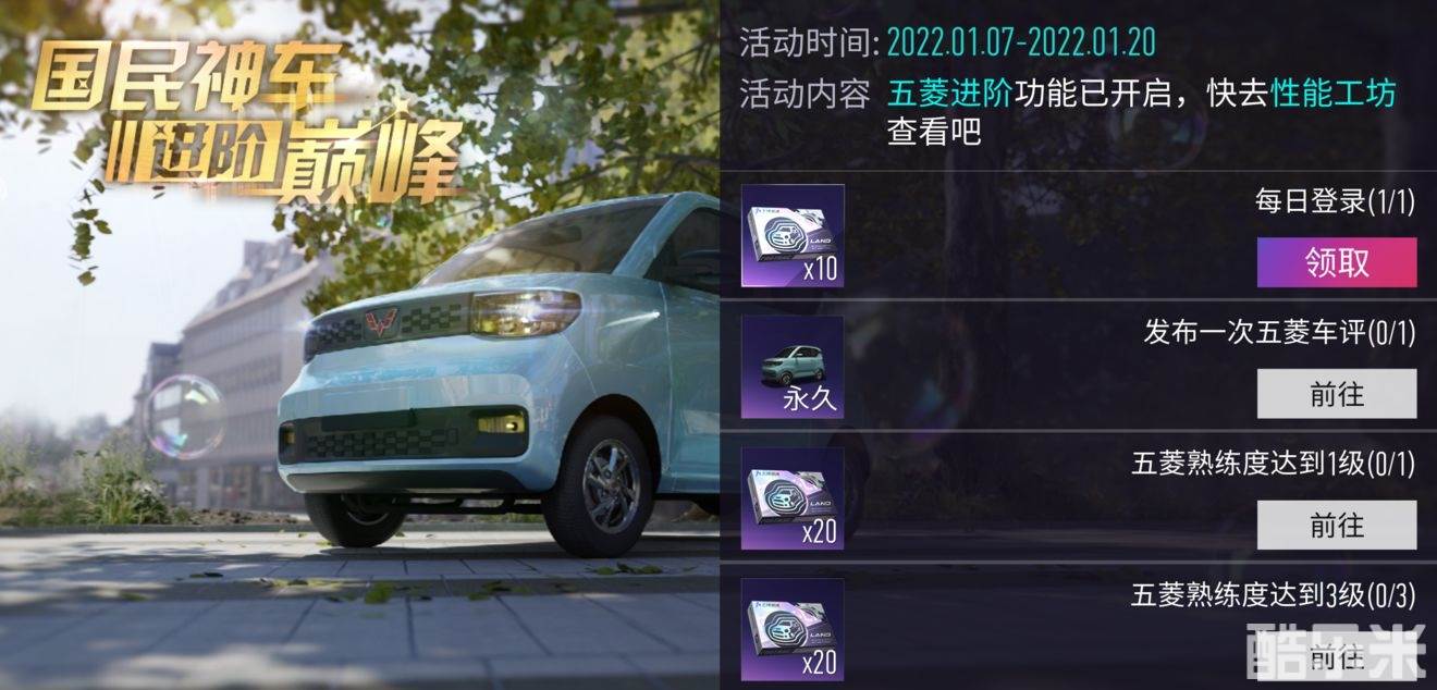 同时,此前未获取五菱宏光MINI EV的车手们也无需担心,国民神车将加入全新活动,免费获取!车手们在1月7日-1月20日参与“国民神车,进阶巅峰”活动,发布一次五菱车评,即可免费永久获得五菱宏光 MINI EV!完成任务更可领取海量零件、蓝图及进阶材料!一键领取国民神车,助力进阶,勇攀巅峰!