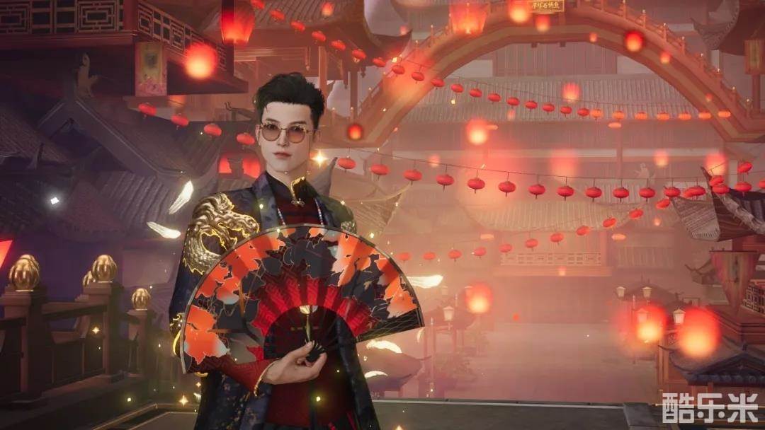 男车手佩戴同款复古老板镜,手持折扇,前卫潮流的舞步吸引所有人的目光,飞舞的折扇带出点点星光及金色落羽,祥龙飞过,全屏出现金色粒子光效,男车手身后出现巨大的金色光盘,金光灿烂,叫人挪不开双眼。