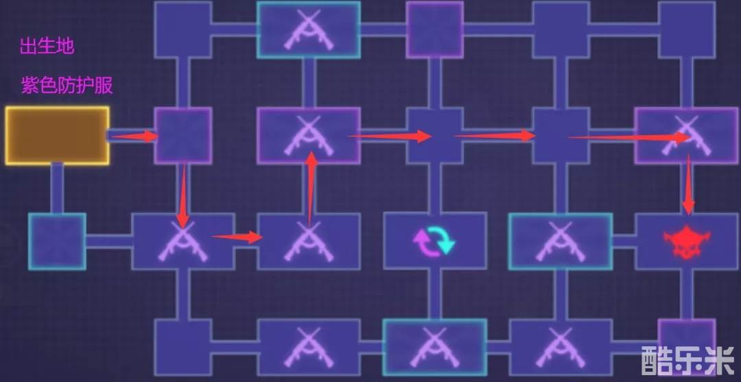 每局关卡,出生地、换装装置、辐射区域、BOSS地点都是随机生成的,每局的位置并不固定。