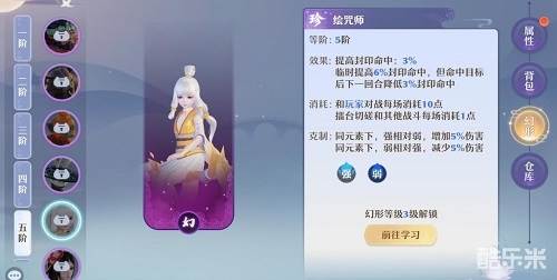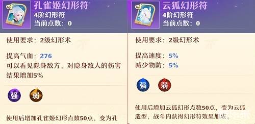 3、除了元素属性的加入,本次幻形符玩法的升级还加入了6张全新的幻形符。四阶幻形符孔雀姬和云狐,其中孔雀姬可以帮助玩家看见隐身单位,并且增加对隐身单位的伤害,可以配合输出职业用来对付隐攻宝宝;云狐则是提高5%的速度,减少5%的物防,可以搭配合欢等高速门派使用,但抢一速的同时需要注意生存空间。
