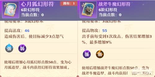 5、六阶幻形符心月狐和战斧牛魔,心月狐在提高法攻的同时可以减少目标的怒气,与法系输出门派简直是绝配,再也不用担心自己的AOE伤害会给对面送怒气了;战斧牛魔则是物理输出门派的福音,该幻形符在提高物攻的同时,还能够百分比提高伤害结果,最高可达到9%,非常适合用来点杀敌人。