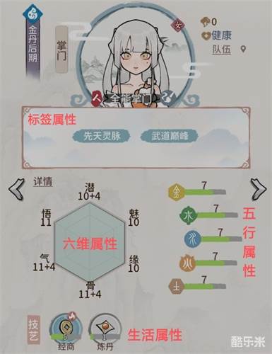 简单来说,技艺也就是生活属性的作用,就是提升弟子进驻对应场所建筑后,能拥有更高的产量或更高的成功率。阵法、炼丹、炼器、制衣、巧匠、经商,只需要一个属性最高的即可,至少大于5,越高越好!