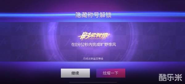 1、时不我待称号获得方法:在0分52秒内完成旷野惊风,这个称号对于玩家的技术有比较高的要求。
