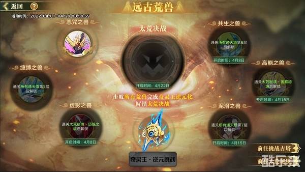 2、远古荒兽中的挑战随4月版本周更开放,每周更新后开启2种挑战,且只有通关太荒秘境特定难度或通天古塔特定层数才能解锁对应挑战。