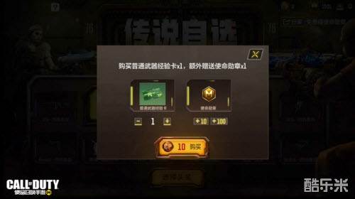 头奖选择完毕后,战士们仅需消耗10COD点券,就可购买普通经验卡*1,并额外获得使命勋章*1。