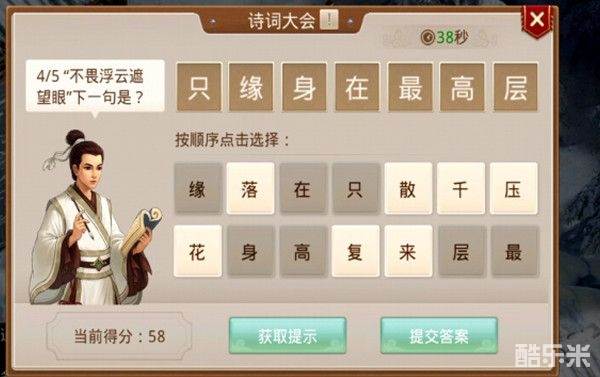 其中有一道题问的是不畏浮云遮望眼的下句,这道题的答案是只缘身在最高层。