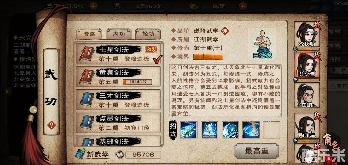 烟雨江湖中七星剑法是比较强力的一门剑法,输出比较高,能够给很多的角色使用,搭配好队伍的话能够发挥出比较大的作用。七星剑法如果能够凑齐五式的话更是能够将输出最大化,下面我们一起来看看七星剑法怎么凑齐五式~