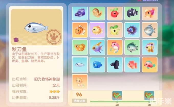 3、本次更新中除了秋刀鱼之外,还加入了蓝茉莉鱼、黑玛丽鱼、对勾鱼一共四种新的鱼类,玩家可以前往不同区域的水域中钓鱼解锁图鉴;