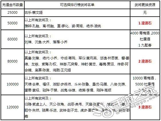 1、活动期间,累计充值金币数量达到对应金额,可以联系在线客服申请1个排行榜武将奖励,或对应金额的进阶酒或澄源石奖励;