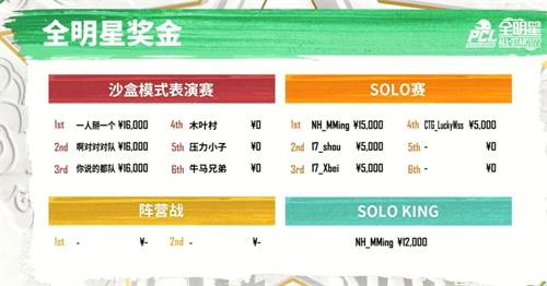 沙盒模式的奖金共48000元,每局胜者为8000元;SOLO模式则总奖金为30000元,每局胜者为5000元;阵营战模式为60000元,每局胜者为12000;获得SOLO KING称号的选手则可收获12000元的奖金。