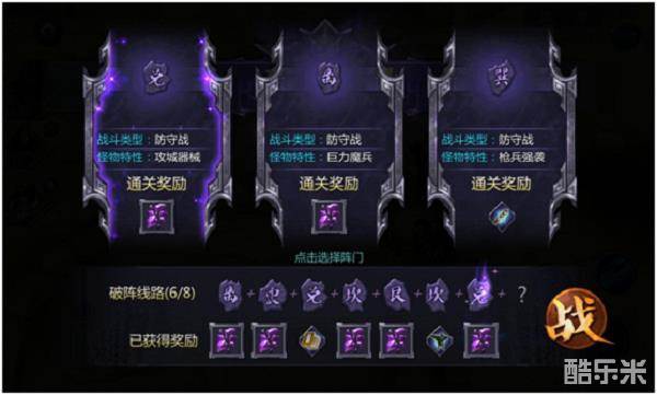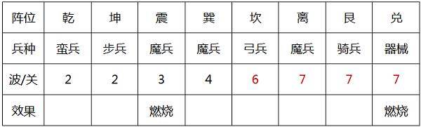 这里需要注意的是:在6-7波的关卡(即第5关及以后的关卡),若实力不足,千万不要选择妖术、联合、器械等驻守的阵位,因为,在破阵过程中没有血瓶,很有可能抗不过燃烧的效果。