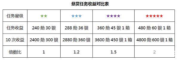 在大世界任务功能中,有世界任务和悬赏任务两种,悬赏任务一天为固定次数10次,无法增加——当然不知道后续高级VIP是否会增加购买次数,因此,想要获得更多的收益就必须要了解悬赏任务的级别及对应的收益。