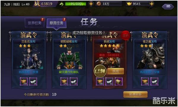 悬赏任务,每次刷新4个,每次只能接取并完成1个后才能接取其他的。接取任务后,时限为4小时,若4小时还未完成,则视为放弃,但并不会减少你完成任务的次数。所以,如果你打开刚好看见有5星任务的时候,一定要在第一时间接取...........