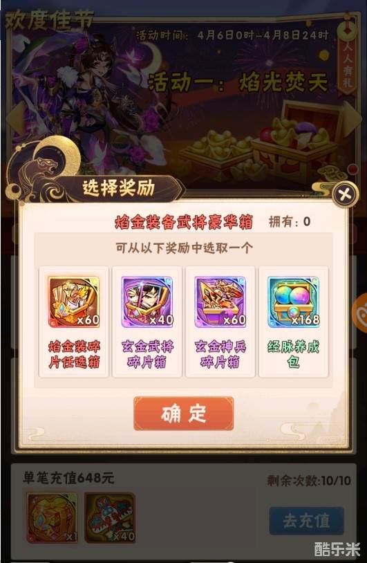 在活动期间少年们单笔充值至指定金额,即可获得焰金装碎片任选箱、玄金武将碎片箱、玄金神兵碎片箱、经脉养成包、纸鸢等资源: